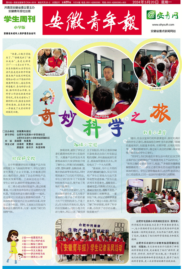 《安徽青年报·学生周刊》励志启智,开阔视野,净化心灵,陶冶情操,参与互动,集新闻性、知识性、趣味性、互动性为一体,是小学生成长的良师益友、参与互动的平台、沟通老师家长的纽带。