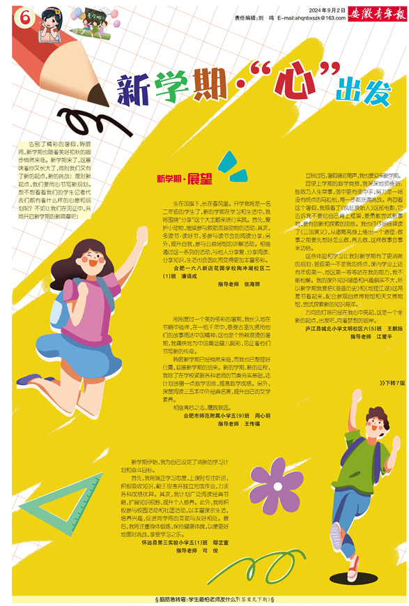 《安徽青年报·学生周刊》励志启智,开阔视野,净化心灵,陶冶情操,参与互动,集新闻性、知识性、趣味性、互动性为一体,是小学生成长的良师益友、参与互动的平台、沟通老师家长的纽带。