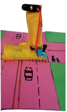 5.用硬卡纸做了一个马路造型,用胶带把信号灯、底板封好固定在卡纸上。
