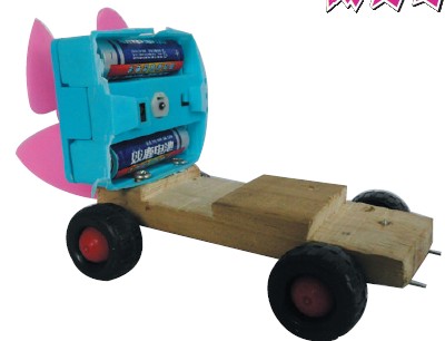 选择一块长方形的木块,在木块的底部安装四个支架,再把废旧的玩具车的轮子装在支架上,然后选一个废旧的玩具电风扇用两个螺丝固定在木块的后半部,两节电池安装在电风扇上,最后再给整个小车进行包装美化。启动风扇把风力转化成动力驱使车子行动。