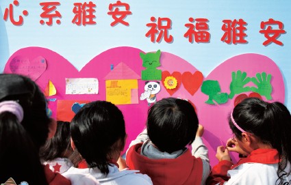 地球是运动的,你不会一直处在倒霉的位置。 红领巾心声 话说校园 4月24日下午,合肥市蜀山小学的同学们得知四川雅安市发生了7.0级地震的消息后,在老师的带领下,自制卡片为雅安人民祈福。同学们纷纷在愿望卡片上写下寄语表达对灾区人民的关心与支持。“加油!雅安!祈福!”“雅安坚强,为雅安人民祈福”“雅安加油,我们同在”“雅安,你好吗?”……图为祈福活动现场,同学们正在将亲手制作的卡片贴满愿望展板。 |