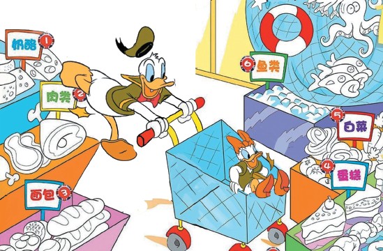 胡说八道 周末大采购 又到周末啦,为什么不是工作日2天,周末5天呢?那样,玩耍的时间就更多了!好吧,让我们打住这样不切实际的妄想。周末,你会做什么,妈妈的超市大采购,你会加入吗? 现在,糖果邀你加入唐老鸭的狂欢大采购。这是一家百货便利店,可货架上的东西都失去了颜色,你能帮助它们恢复色彩吗?(本期题型为填色,无固定答案。)