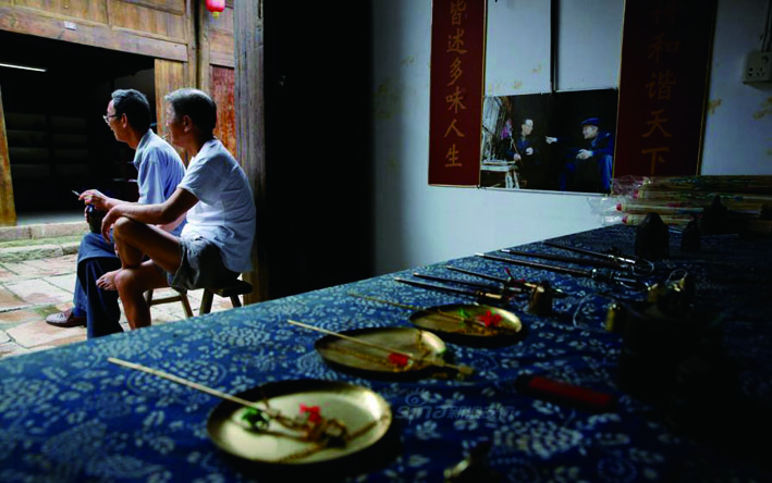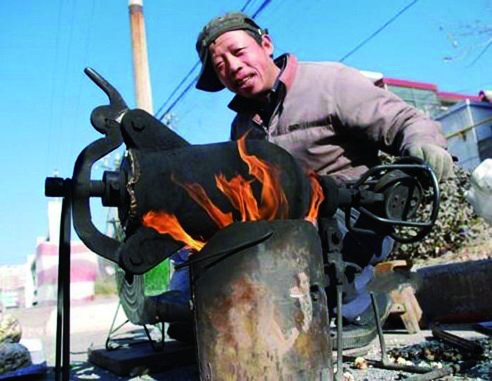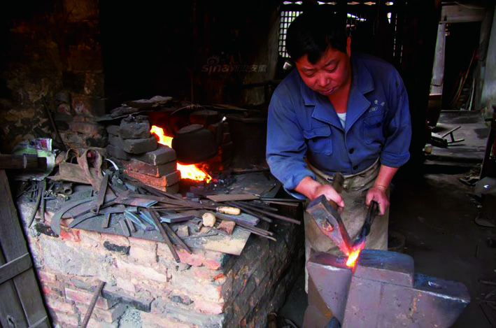 “叮叮当当”永远是铁匠师傅们的生活交响曲。在过去,铁匠师傅永远都握着手中的铁锤。也是在这样欢快的敲击声中,锄头、茅刀、铁耙、菜刀之类的产品,像变戏法般一件接着一件“打”了出来。铁匠铺里总是每天炉膛通红,人影忙碌,风箱声、敲打声,还有那淬(cuì)火声……在这烟熏火燎的生活里,铁匠师傅的脸和手连同屋顶及四周墙壁,也通通在日积月累中渲染成了铁的墨黑色。