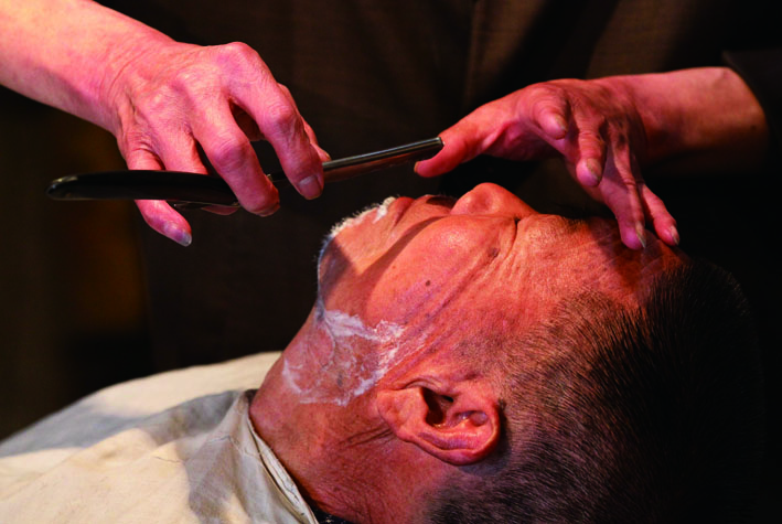 剃头?不就是理发嘛!如果你这样想,那你就错了。和现在流行的“洗剪吹”不同,剃头匠这里,只有一张老式的伸缩椅、一面“复古”的镜子、几个热水瓶,还有一堆奇形怪状的“古董”工具,这些就是剃头匠全部的家当。没有阔绰的门面,没有耀眼的招牌,只见满面胡茬的爷爷躺上伸缩椅,捂上热毛巾,蘸了肥皂沫的胡刷,在脸上细细地一抹。锋利的剃刀在面颊上游走一番,老爷爷瞬间变得精神抖擞起来。