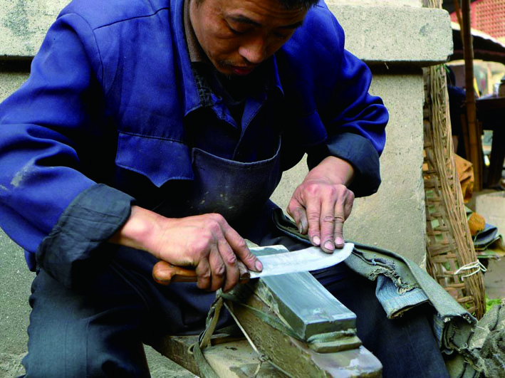 “磨剪子嘞,戗(qiānɡ)菜刀……”这样充满力量而又余音绵长的吆喝声后面,总有一个背着装有磨刀石和小水桶的长凳走街串巷的老人。磨刀看似简单,但在磨刀匠的眼里可是大有讲究。磨刀时用力要均匀、细心,这样磨出的刀才会耐用。不仅如此,和磨刀比起来最难的是磨剪刀,磨的时候不仅要掌握角度,力度也要合适,不然磨出来的剪子就会不好用。