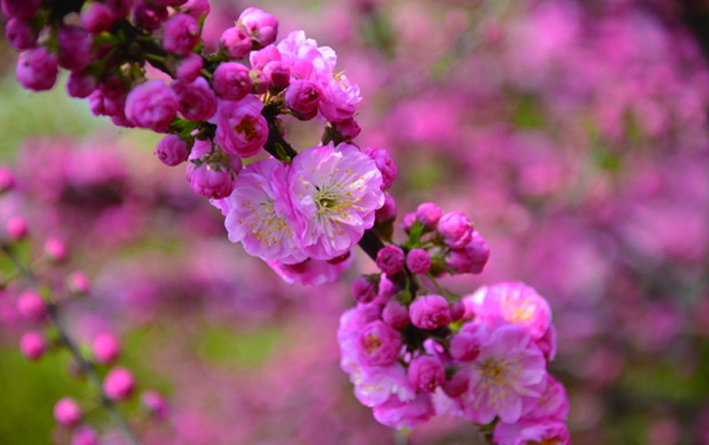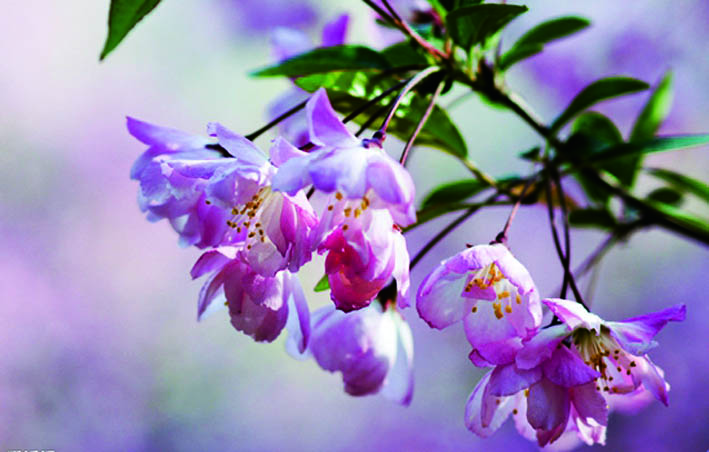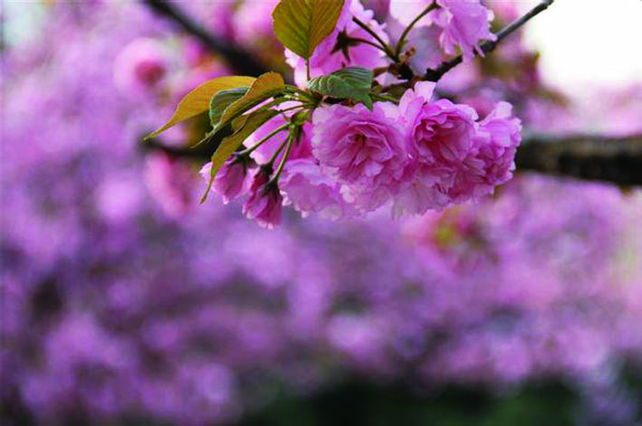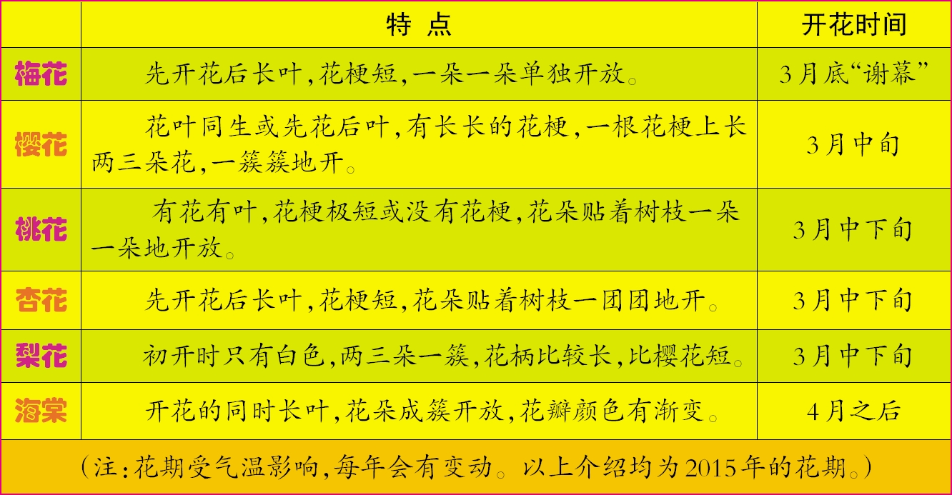 等到梅花慢慢凋零的时候,桃花、杏花、梨花、樱花竞相登场的时刻也到了。这四种花乍一看来都一样,其实它们的区别只要一看花梗就能辨别。樱花和梨花都有花梗,花朵垂下来较难分辨。桃花和杏花的花梗都短,甚至没有花梗,贴着树枝开。 梨花的花梗比樱花稍微短一些,而樱花的花朵更爱“害羞”地低头垂着;梨花一般只有白色,而樱花的色彩丰富,红的、粉的、白的都有;叶子的形状也大有不同,梨花的叶瓣大而圆,樱花的叶子边缘有芒齿;桃花和杏花一样,都没有花梗,要区分它们更容易,只要唱着《桃花朵朵开》的歌词就知道。一朵一朵单独开放的当然是桃花,而一簇一簇挤在一起的则是杏花。 海棠娇艳压落樱 等到海棠和樱花盛开的时节,满树的粉的白的红的,层层渐变的如晕染一般的一定是海棠花了。而樱花则大多是不起眼的白色或粉色。如果说海棠花是雍容华贵的大家闺秀,那么,樱花就显得更像是一个小家碧玉了。从叶片上也很好区分,樱花的叶片有细细的锯齿边,树皮光滑并有横纹,而且枝头有顶芽,这些都是海棠所没有的。 这些报春的花儿排了个花期的时间顺序。大致是在梅花之后,便到了樱花苏醒的时刻。樱花、杏花和桃花的开花时间差距并不大,几乎是一起跑了出来。最怕冷的是海棠花了,它要等到四月份才会姗姗来迟呢 |