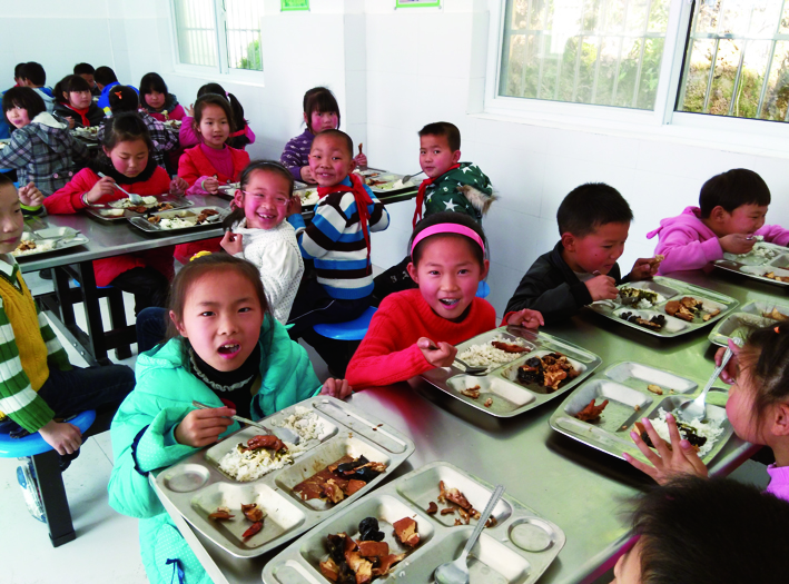 免费午餐开饭啦 近日,在黄山市徽州区岩寺镇中心学校下辖的罗田教学点,由中央直接投资39.66万元修缮的新食堂正式投入使用。图为同学们在整洁明亮的餐厅里享用免费午餐。 □姜晓晖