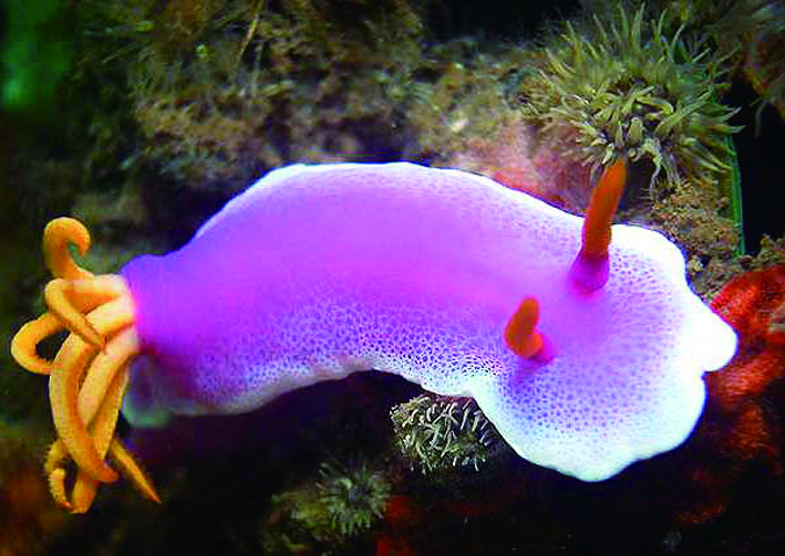 海蛞(kuò)蝓(yú)也叫海兔,是螺类的一种。但是和其他螺类不同,它们的贝壳已经退化为内壳。为了保护自己,它身着变化的“迷彩服”,爬到什么环境里都能随机应变。在绿藻丛中成了绿色,在红藻丛中变成红色,在五颜六色的珊瑚礁环境里,又与珊瑚混为一体,简直是百变到迷人眼。