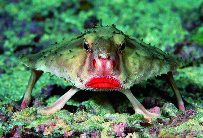 生活在拉帕戈斯群岛的红唇蝙蝠鱼,故名思义有着鲜艳的红唇,身体成梭子蟹一样。不过看鼻子和眼睛就有点像蛤蟆。它有着一个大头,用胸鳍在海底行走,样子实在是囧到家了。