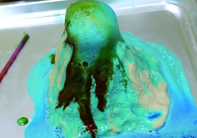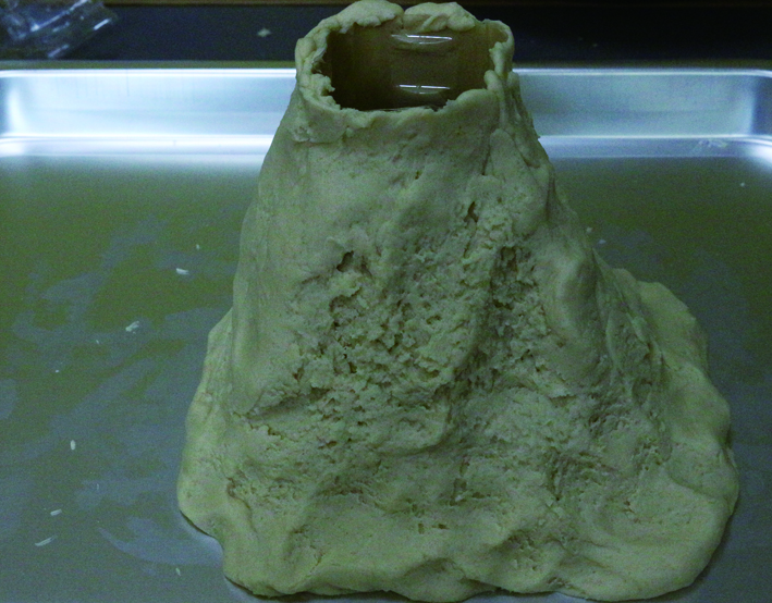 不好了!不好了!爱冒险的醋姑娘攀上了面粉山,结果一不小心掉进了山里,导致面粉山发生了一场大规模的火山喷发事件!哈哈,可不要被吓着了。麦吉猴告诉昊昊,这一火山喷发事件就发生在爱麦吉科学实验室里。究竟是怎么回事?跟着麦吉猴去实验室里看看吧! 准备材料: 制作步骤: 2.准备一个大托盘,用胶带将塑料瓶固定在托盘的中间位置。接着将揉好的面团,一层层地覆盖在塑料瓶的周围,做成一个火山模型,并将没有面团覆盖的塑料瓶上端剪掉。