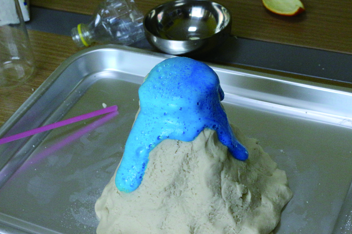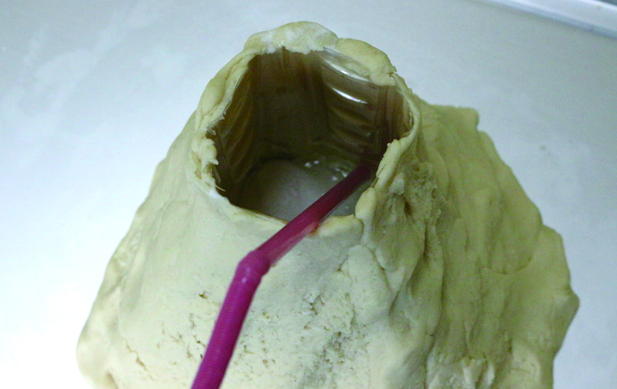4.接下来就是见证奇迹的时刻!将准备好的半杯白醋,慢慢倒入塑料瓶中。很快你就能发现,伴随着“嗞嗞”的声音,一大股淡蓝色的液体从“火山口”喷涌出来。 5.为了增强火山喷发的视觉效果,我们还可以往瓶中加上玫红的食用色素。这样,玫红色的“熔岩”就会从瓶子口喷涌出来,很快就覆盖住了整个“面粉山”。