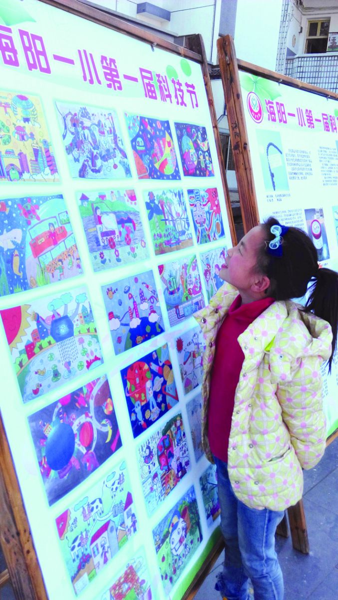 近日,休宁县海阳镇第一小学以“积极实践、勇于创新、快乐成长”为主题,举办了首届校园科技节活动,活动主要包括创新小发明、科技小论文和科幻画三大项。图为一名同学正在展板前,观看科幻画获奖作品。
