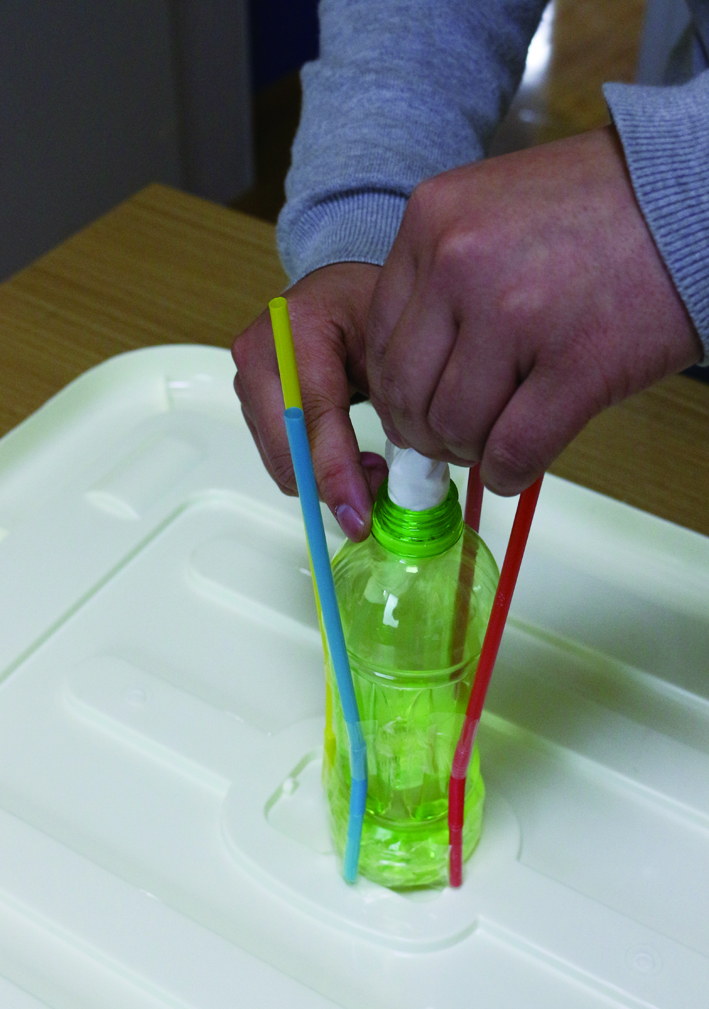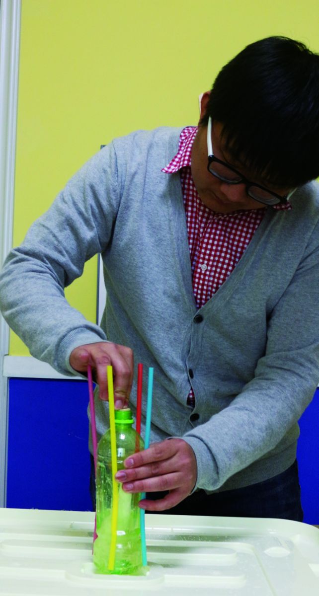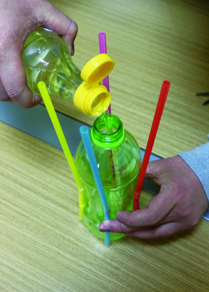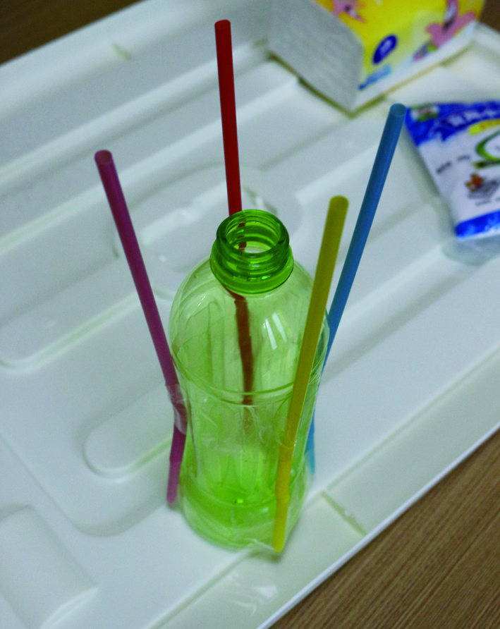 实验步骤: 1.用胶带将四根塑料软管粘贴在塑料瓶的四周,让四根塑料管的两端保持齐平。