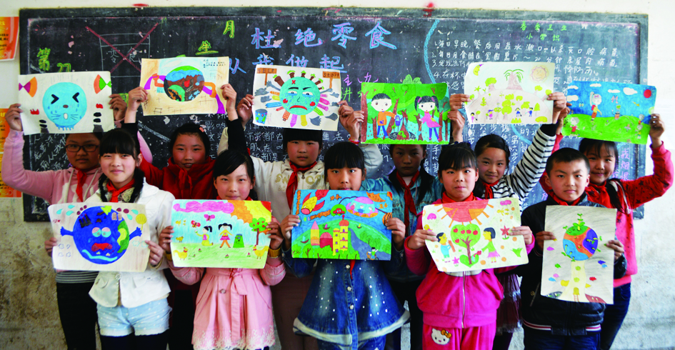 4月22日,是第46个世界地球日。含山县姚庙中心学校以“低碳减排,绿色生活,做保护地球小主人”为主题,开展了一场内容丰富的教育活动,教育大家用实际行动做一名地球小主人。图中,同学们正在展示自己的主题绘画作品。 □欧宗涛