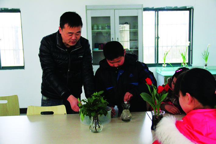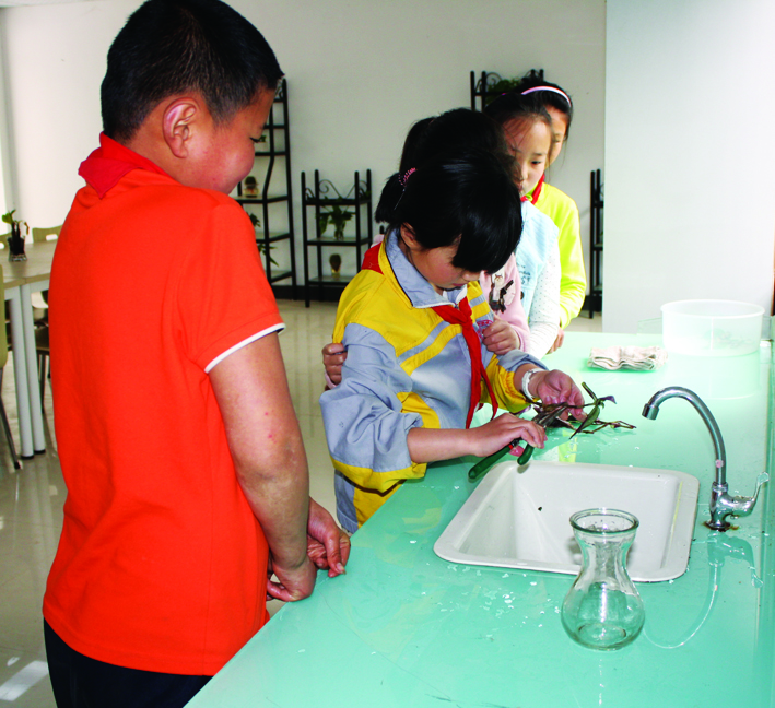 “瓶子里的水要一个星期换一次,换的时候还要清洗玻璃瓶和植物的根部,并用剪刀将烂掉的根和叶子剪去,避免污染水质。重新装水时,普通的自来水最好要晒上一天,这样可以清除掉水中的有害物质。”五年级的侯正旭同学一边处理着手中的吊竹梅枝叶,一边向小J介绍着要点,动作十分娴熟。在同学们的精心照顾下,一瓶瓶水培植物都冒出了嫩嫩的根须,准备伸展枝叶、蓄力开花。
