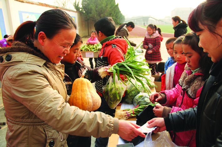到了收获季,同学们摇身一变就成了“小摊贩”,在学校门口开始了蔬菜义卖。同学们出售的蔬菜不论斤不定价,多少钱一把让买主们看着给。来捧场的不少都是同学们的爸爸妈妈。校长徐诗友告诉小J,同学们的菜园子已经收获了三季,目前已经向同学们捐赠了两千多元了。