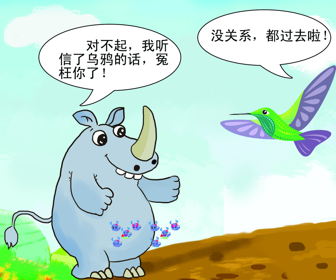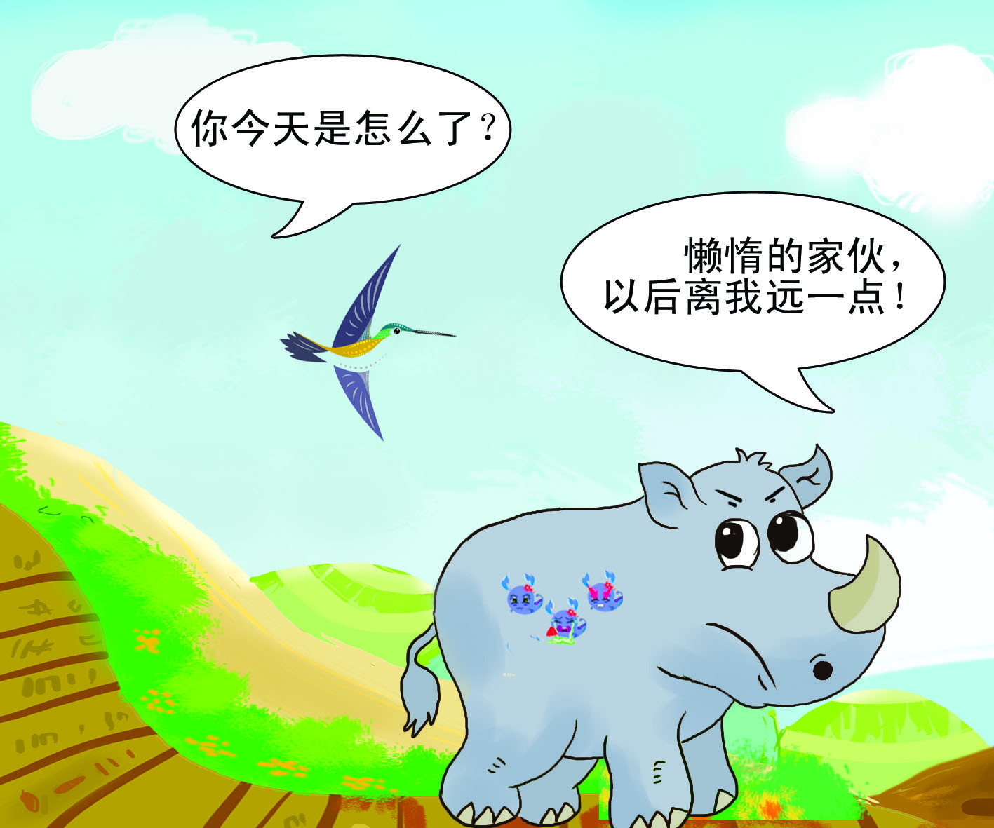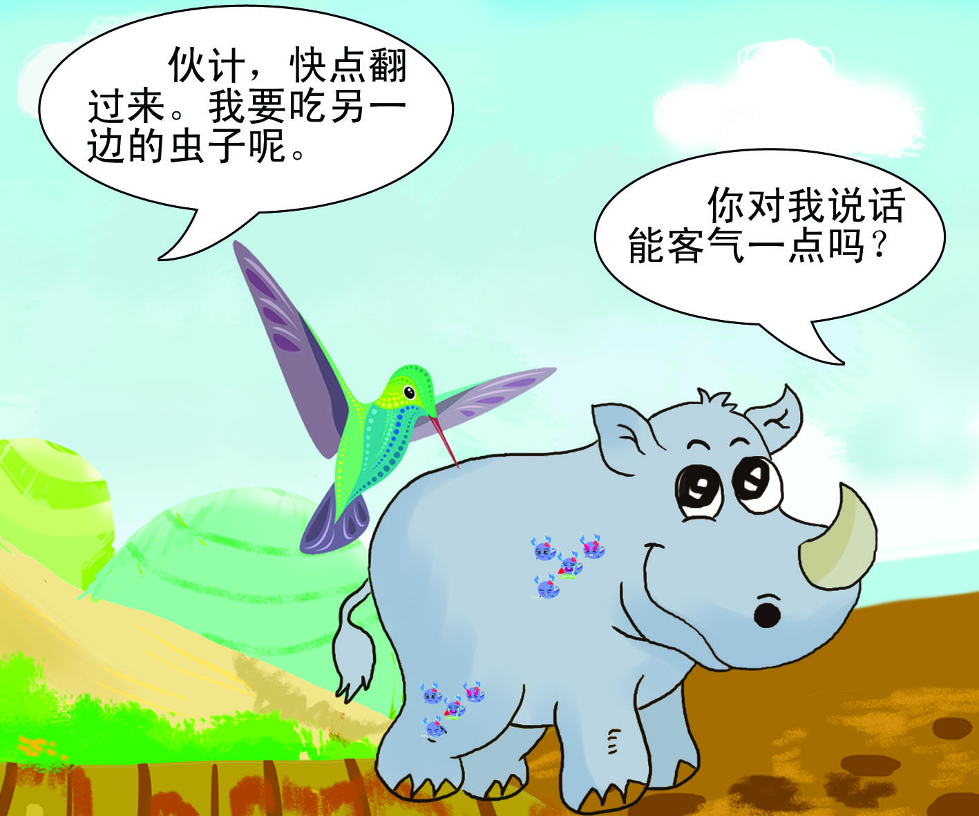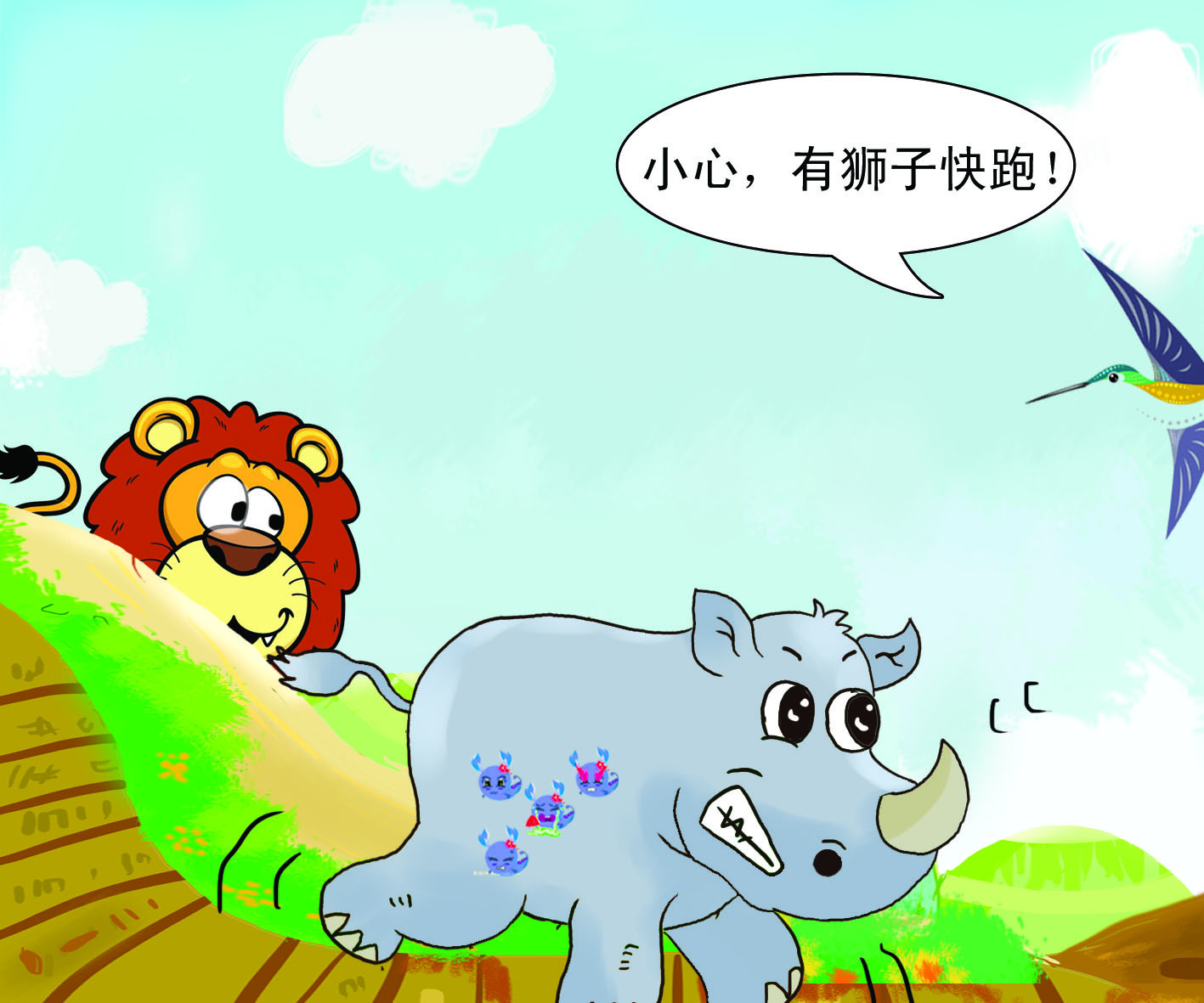 犀牛脾气总不好,别说惹恼了它,就算是在它心情好的时候打扰到它,它也会大发雷霆。不过,除了它的好朋友犀牛鸟。犀牛鸟总是落在犀牛的背上,赶走犀牛背上的吸血虫;还在有敌人来的时候,上下翻飞地提醒犀牛有危险。因此,它俩总是形影不离。这一点,让搬弄是非的乌鸦先生看在眼里,非常嫉妒。于是,乌鸦跑去犀牛那里说犀牛鸟的坏话,说它是一个不劳而获并且傲慢的家伙。 |