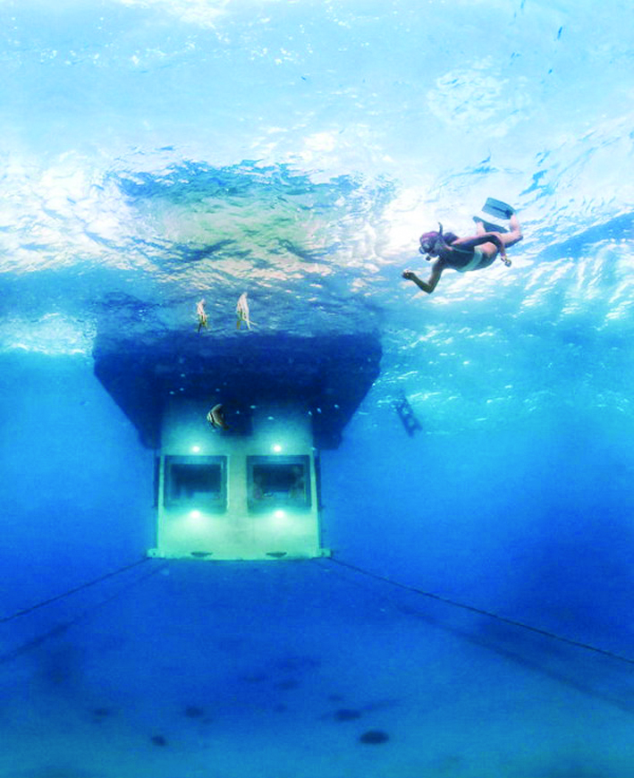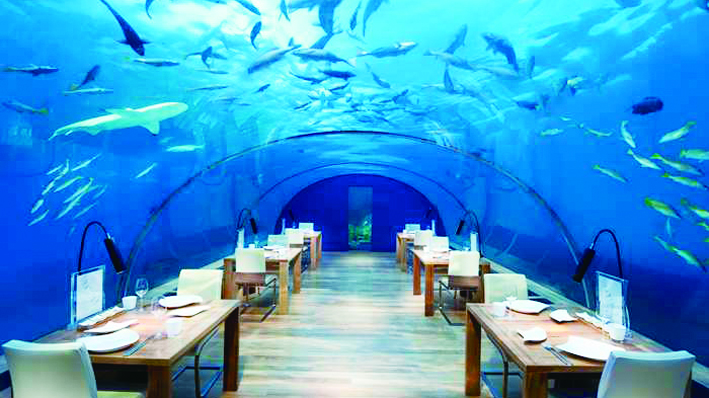 你听说建在水下的餐厅吗?在美丽的马尔代夫港丽岛,就有一个闻名全球的水下餐厅。它位于印度洋海面下六公尺处,是世界上第一个360度全玻璃制造的水下餐厅。在这里,你可以看到各种艳丽的珊瑚礁围绕在四周,各色热带鱼类在身旁游来游去,绝对能让你享受前所未有的用餐体验。