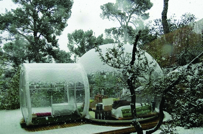 野外露营的时候,你会不会特别希望可以睡在透明的帐篷里看看星空?在法国,就有个奇特的气泡水晶球旅馆。设计师将它设计成一个侧躺着的圆底烧瓶,瓶身里是床铺、椅子和一些简单的家具。这样,你就可以住在“水晶球”里欣赏大自然啦。不过,你可要小心不要被别人看到你流着口水的睡相哦!