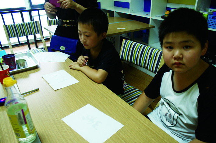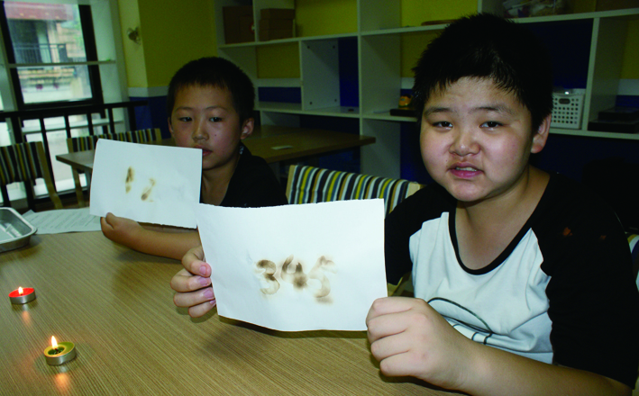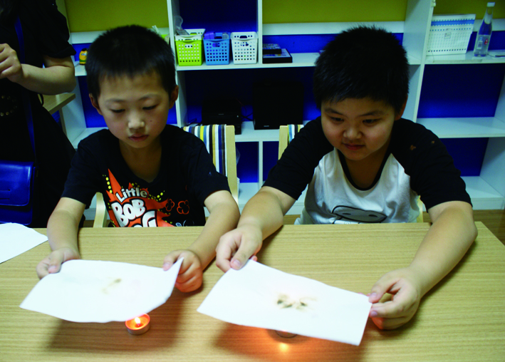 “密信”不神秘 2.白纸平放在桌面上,等待白醋晾干、字迹消失。(发呆ing……等待ing……) 3.此时,白纸上已经没有了字迹。我们再将蜡烛点燃,将白纸放在火焰上面烘烤。(小助理温馨提示:烘烤时一定要掌握好纸张与火苗之间的距离。可不要将纸烧坏,以免前功尽弃!) 4.1、2、3、4、5,“新鲜出炉”的几个数字你能看到吗? 科学原理: