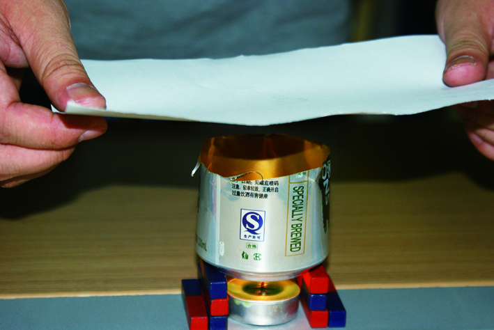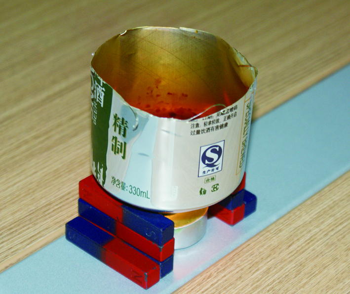 指纹现“原形” 在警方破案过程中,犯罪嫌疑人的指纹是警察叔叔的首要搜寻“对象”。而在我们的科学游戏中,大家也可以运用一些科学“小手段”,让隐匿的指纹“现出原形”。 准备材料:碘酒、易拉罐小盒、蜡烛、白纸 2.易拉罐中倒入少量碘酒,浅浅的一层即可。然后用磁铁堆出一个简易“灶台”,点燃蜡烛给碘酒加热。(“野炊”即视感有木有?) 3.当碘酒开始挥发,罐中飘出紫红色蒸汽时,将白纸印有指纹的一面朝下,平置在蒸汽上方。(请耐心等候指纹“现出原形”。)