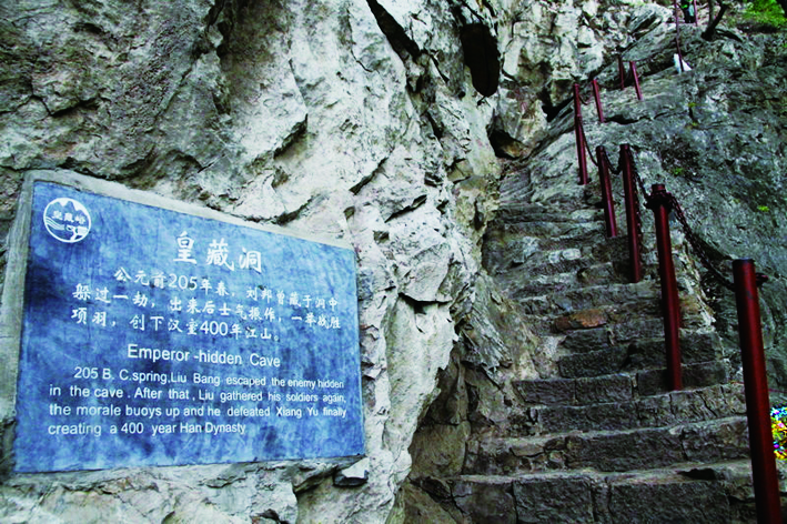 由瑞云寺往西南行,步步登高,二百多个台阶,约140米,再攀悬崖、越峭壁,可见一洞,这就是著名的皇藏洞了,此风景区的名字就是由此而来。和三字对齐的就是飞来石了,从石底下进洞会发现,洞深10余米,呈圆形,四壁光滑,顶壁如穹,其底平坦,可容十余人盘膝而坐。但是里面刘邦带两个侍卫占位,那洞里就容纳不下几个了,然而一想只是取其意,重点也不在景啊,太大了怎么能藏的了呢。