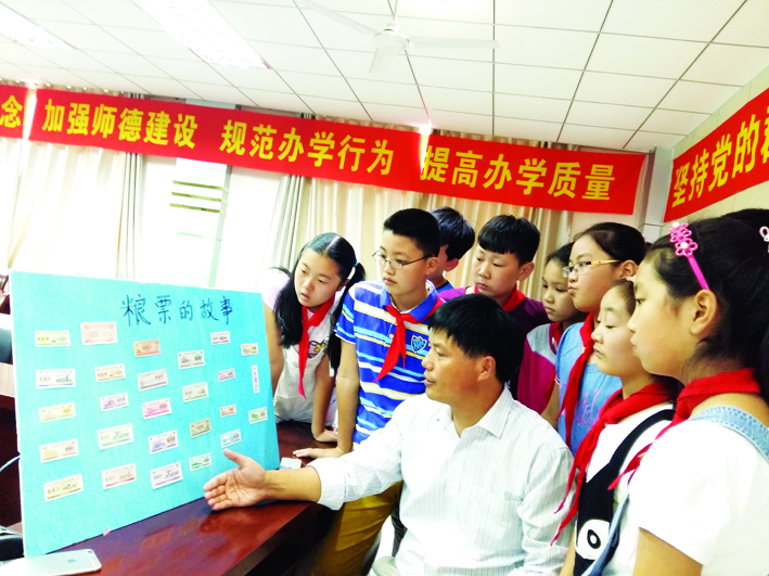 图说:22日,华小将“粮票的故事”搬上课堂,给同学们上了一堂特殊的历史课。一张张颇具年代感的粮油布票证,给同学们讲述了一段段票证年代的故事。