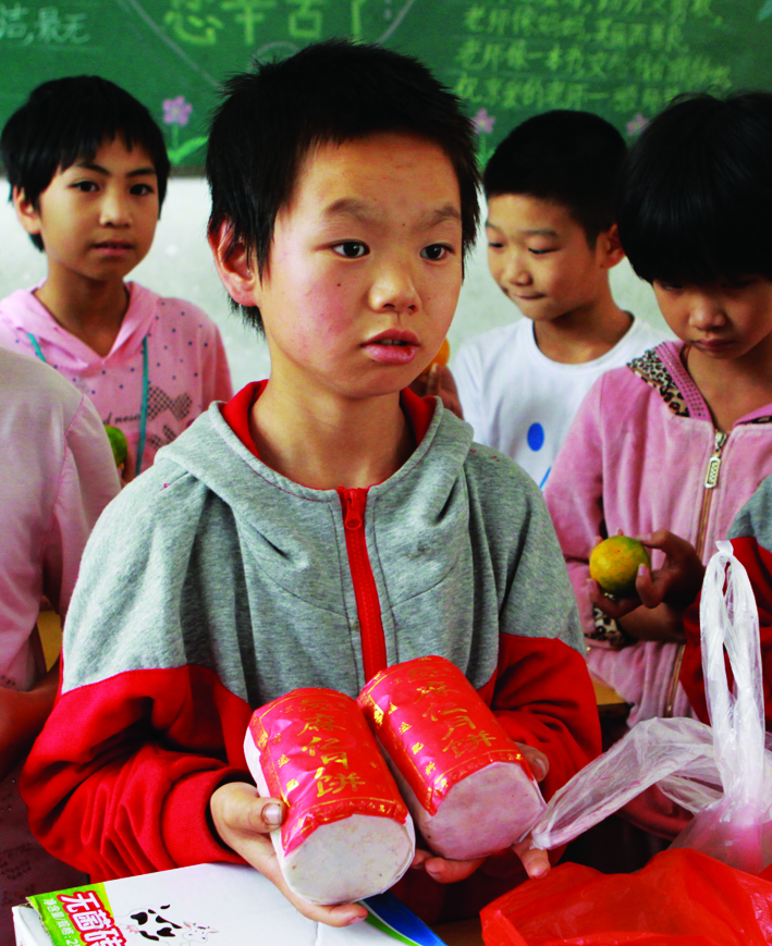 图说:“一扎月饼给奶奶吃,一扎留着等妈妈回来。”23日,黄山市微公益爱心人士来到鹤城中心小学,看望家境困难的谢凯锋同学,并为他带来了月饼、水果、牛奶等礼物。谢凯锋将水果分发给班上的同学后说,想起了一年多没见上面的妈妈。