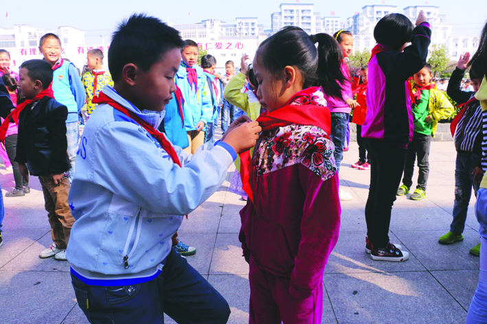 10月13日是一年一度的建队日。黄山市岩寺小学在主题对会上为年满6周岁的340多名新生举行了入队仪式。图为入队仪式上,一名少先队员帮助同学系红领巾。