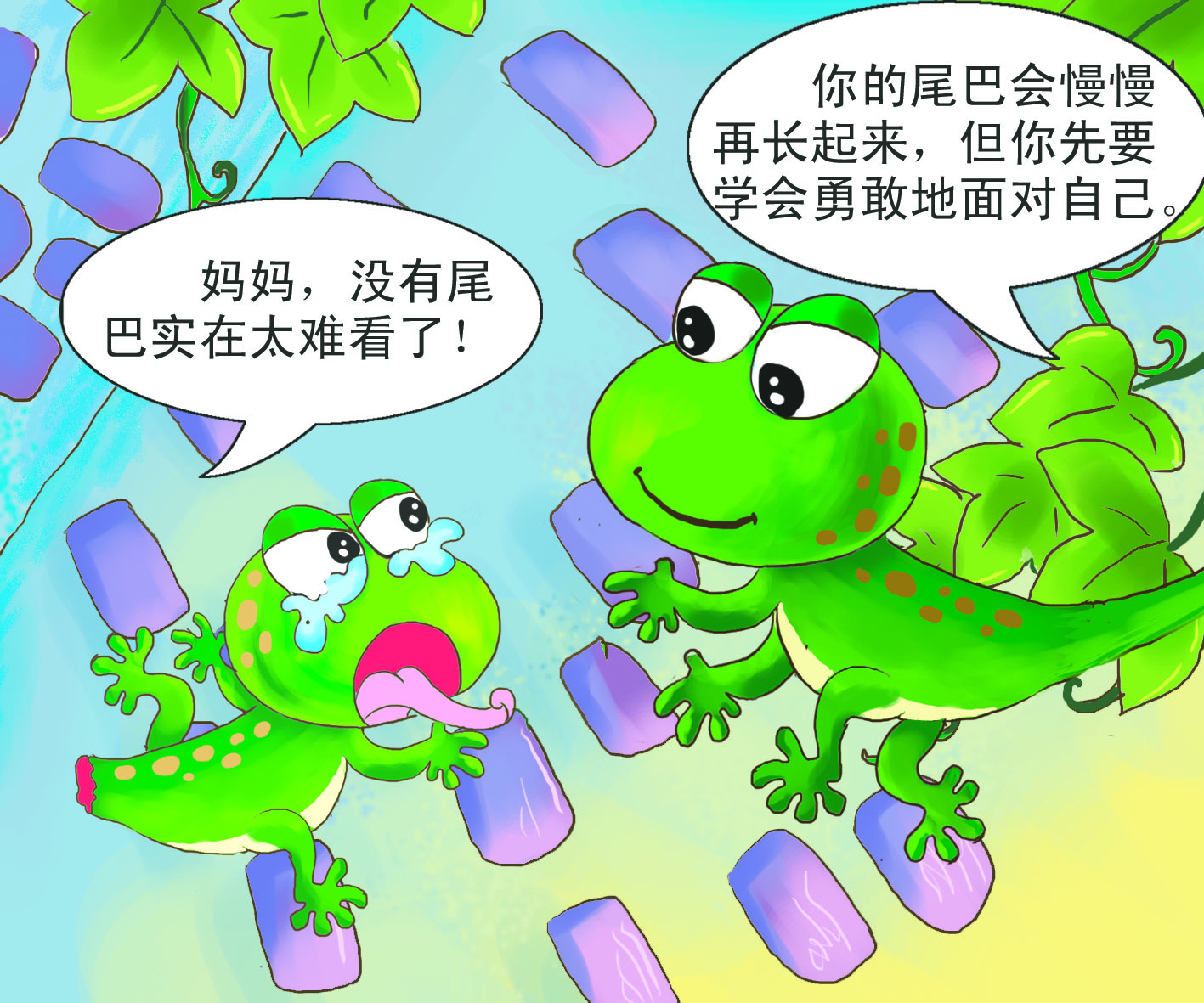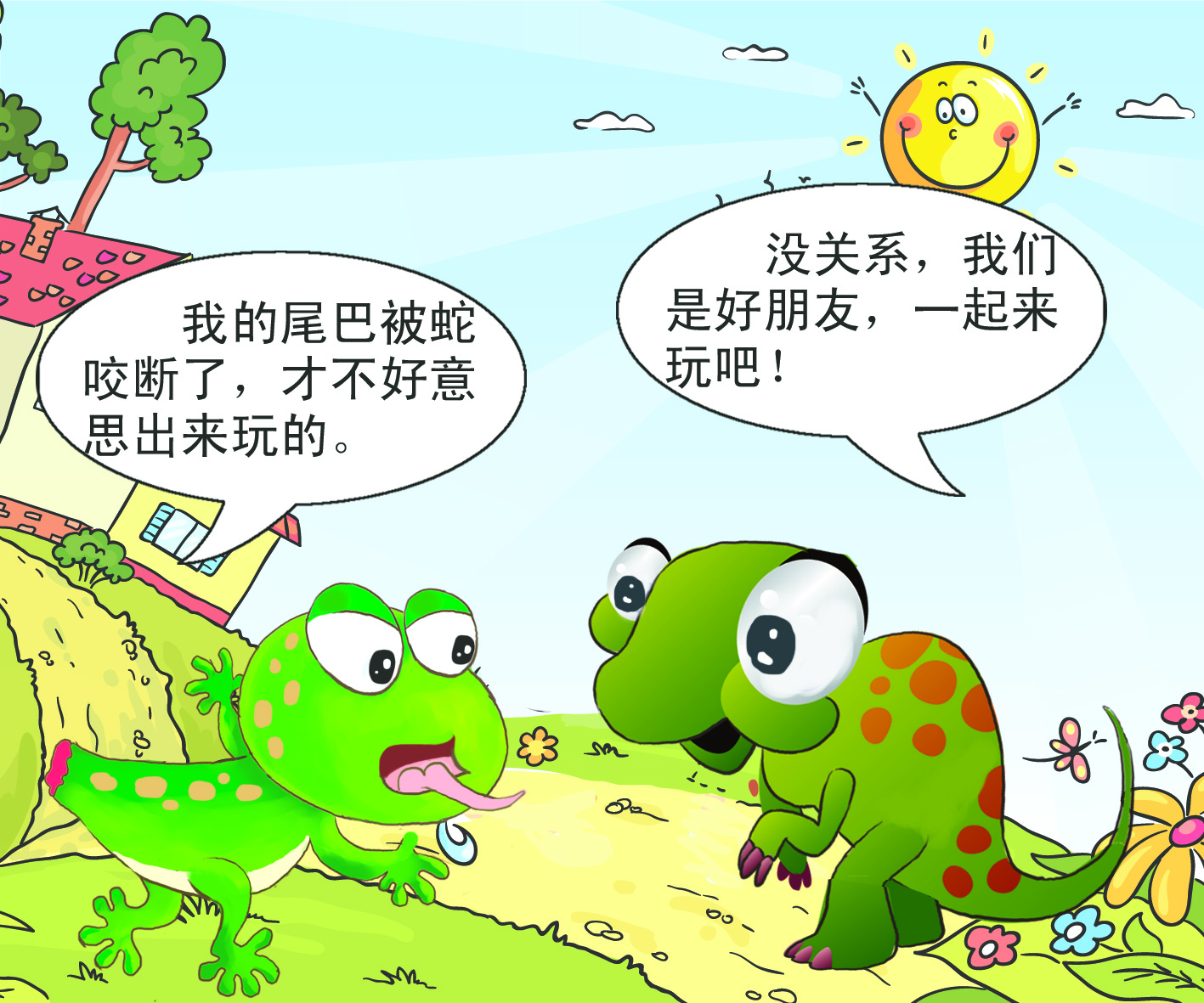 可爱活泼的小壁虎在树林边玩耍的时候,不小心遇到一条青色花斑蛇。花斑蛇狠狠地咬住了小壁虎的尾巴,小壁虎拼命挣扎,直到尾巴断了,才逃了出来。可是,自打小壁虎断了尾巴,就整天待在家闷闷不乐,也不再愿意和朋友们出去玩。