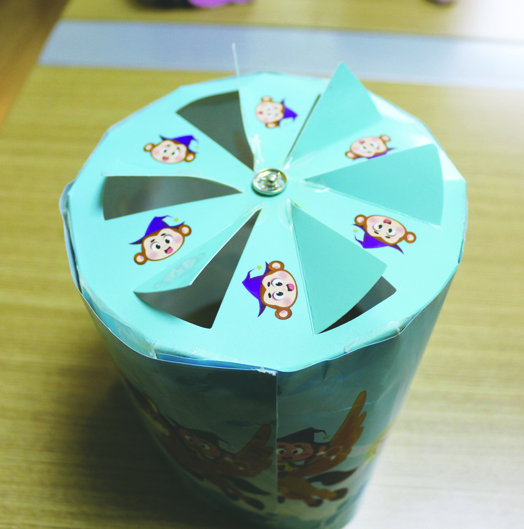 1.准备一张圆形的硬壳纸,在上面均匀地刻出小口,折出一个小风轮,并在风轮中心处钻一个小洞,用按扣扣住;(按扣带有凹洞的一面在下方)
