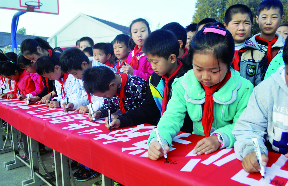 时间:11月6日 地点:含山县姚庙中心学校 图说:在“告别陋习·文明礼仪伴我行”教育活动中,同学们在宣传横幅上签下自己的名字,承诺向陋习告别,争做一名讲文明的好少年。