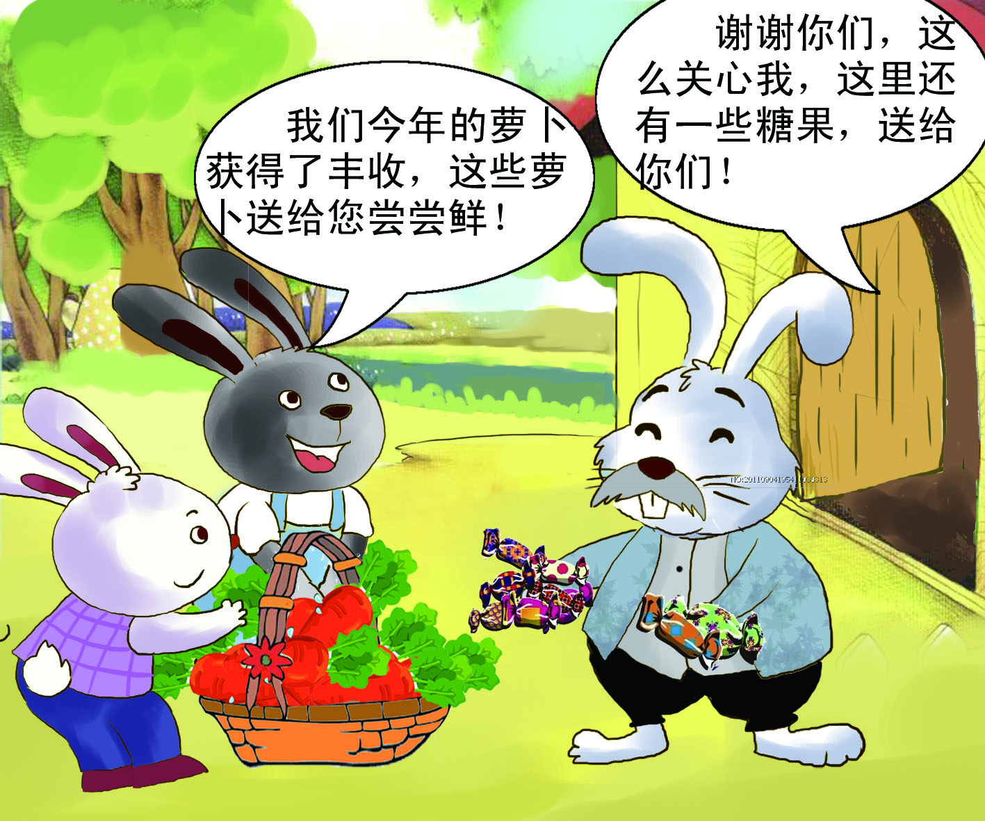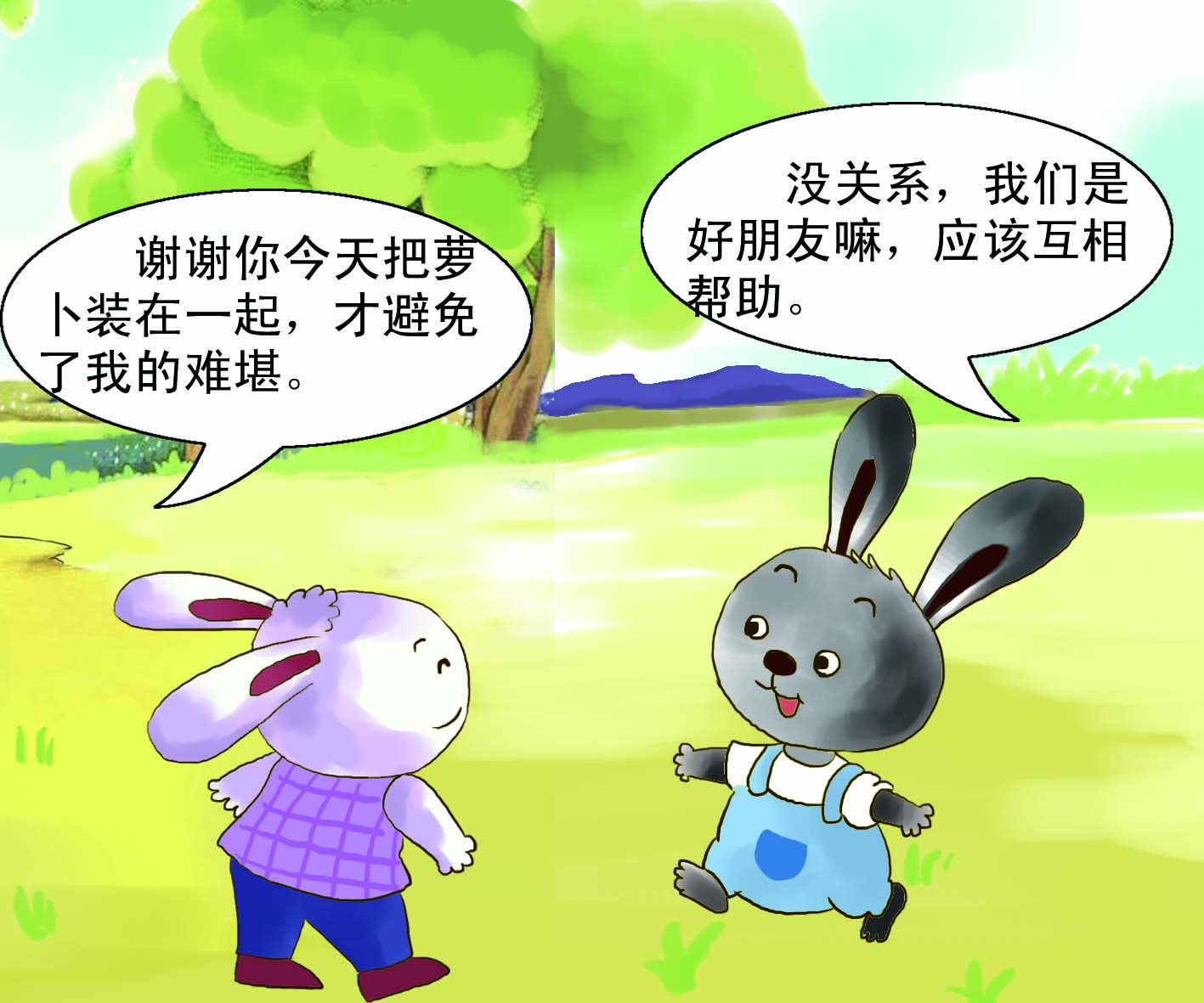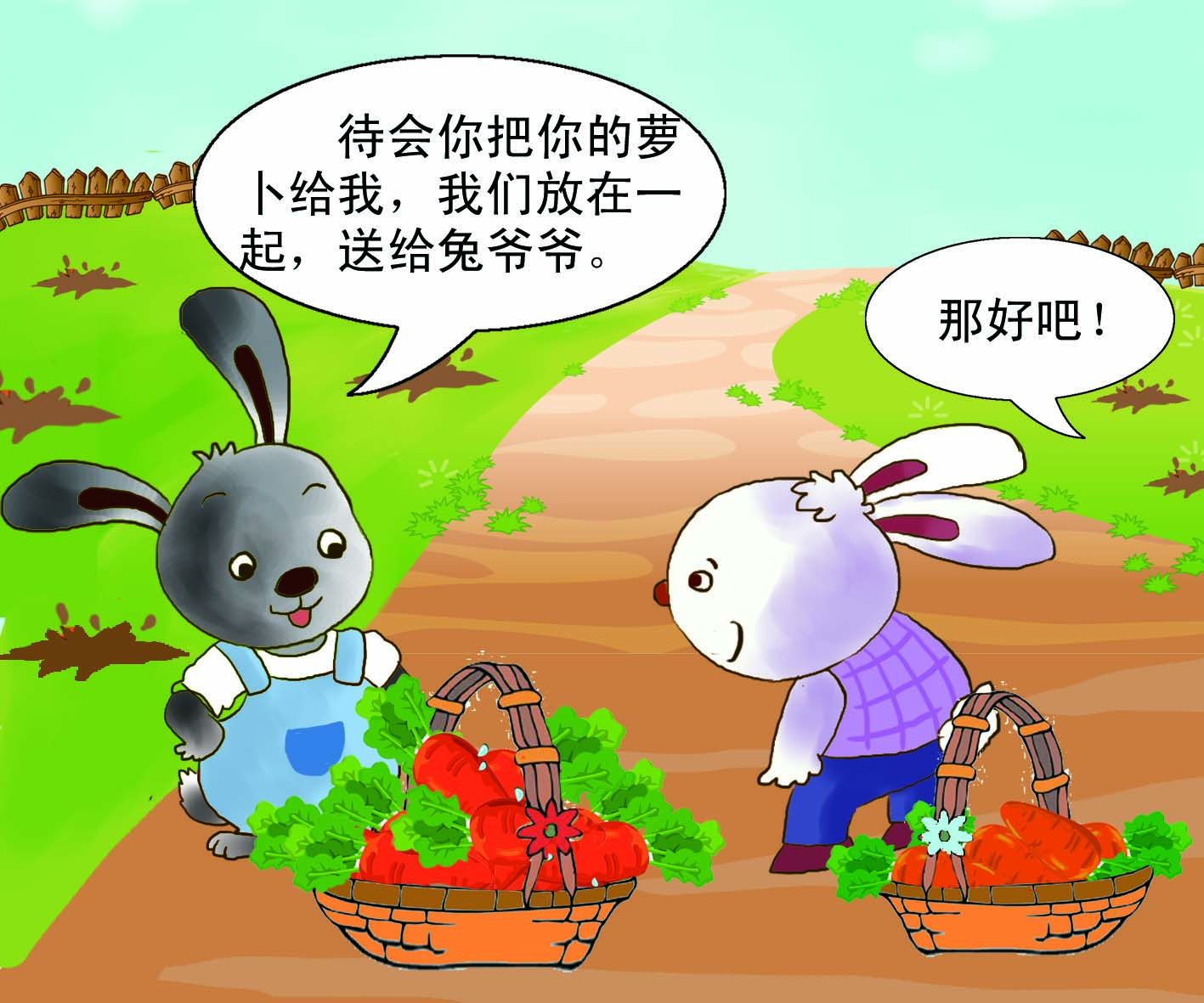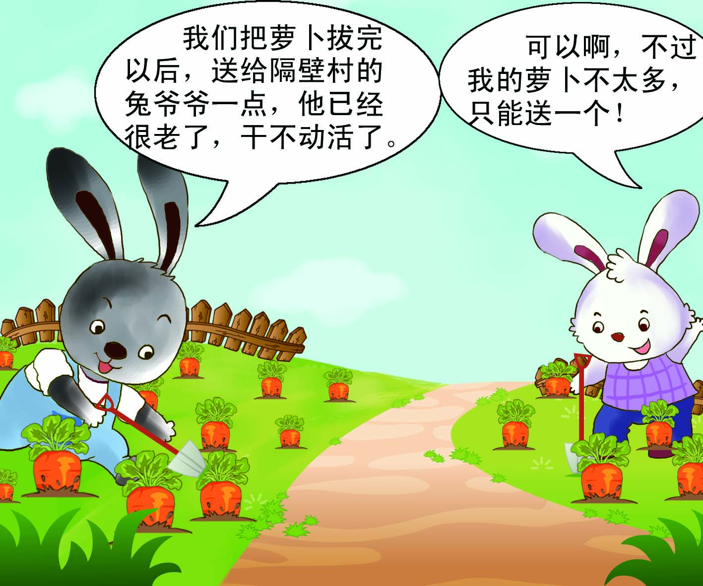 转眼间秋天到了,地里的萝卜长大了。小白兔和小黑兔开心极了,他们约好时间一起拔萝卜。
