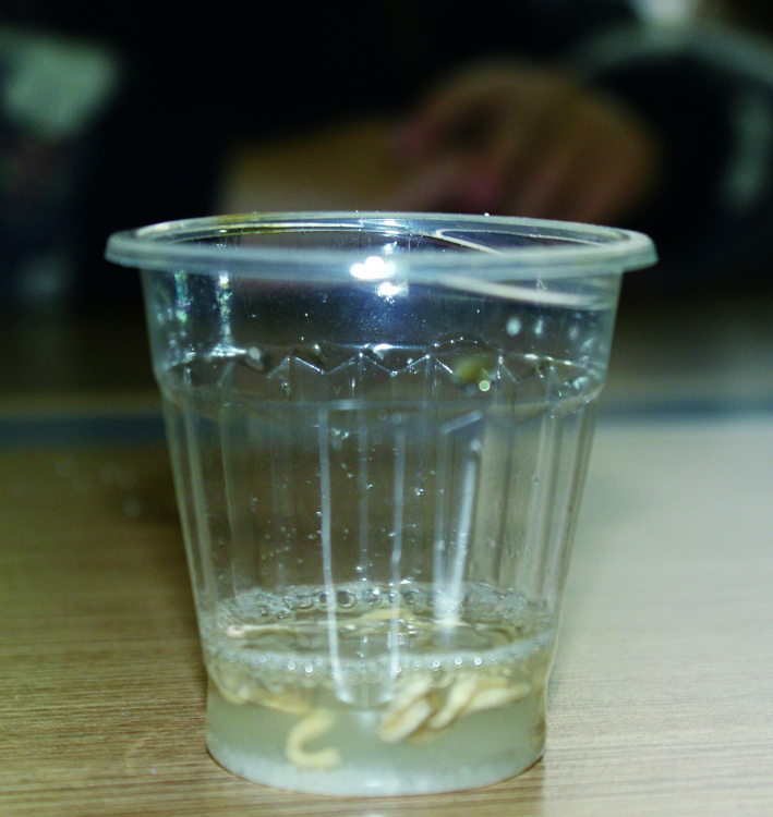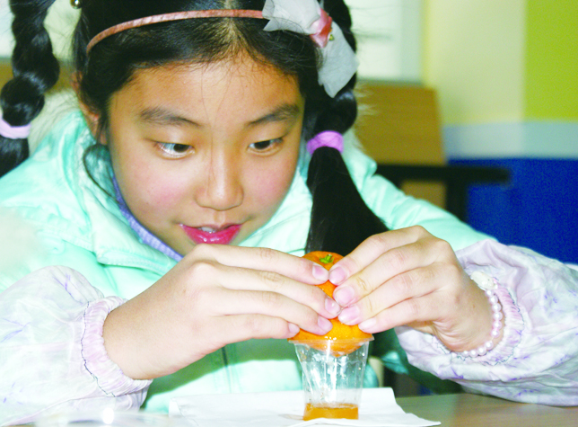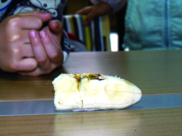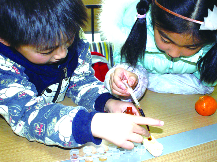 果蔬学校大课间,土豆不小心蹭破了皮。橘子姐姐拿来碘酒,给土豆涂上消毒。可不一会儿,奇怪的事情发生了——土豆受伤的皮肤变成了蓝黑色。“难道碘酒变质了?”橘子姐姐也取了几滴碘酒,涂在自己身上。这回,更奇怪的事出现了——橘子身上的碘酒消失了! 小助理Q档案 小助理Q档案 Part1 “变色王”的变脸秀 2.一小段时间后,我们可以发现:被碘酒浸泡的方便面,已经从白色变成一种蓝黑色; 碘酒变色的秘密: Part2 维C含量大PK 1.取汁:为了确保果汁的纯度,小助理们直接从西红柿和橘子中榨取果汁; 3.取一小截香蕉,用手指按出一个凹洞,往里面滴两滴碘酒。
