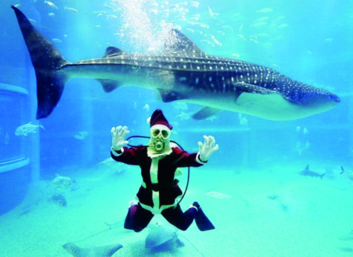 为迎接圣诞,日本一家水族馆让圣诞老人与凶猛的鲸鲨在水中互动,惊险场面引得游客尖叫连连。圣诞老人,你要保重,我们还等你发礼物呢!
