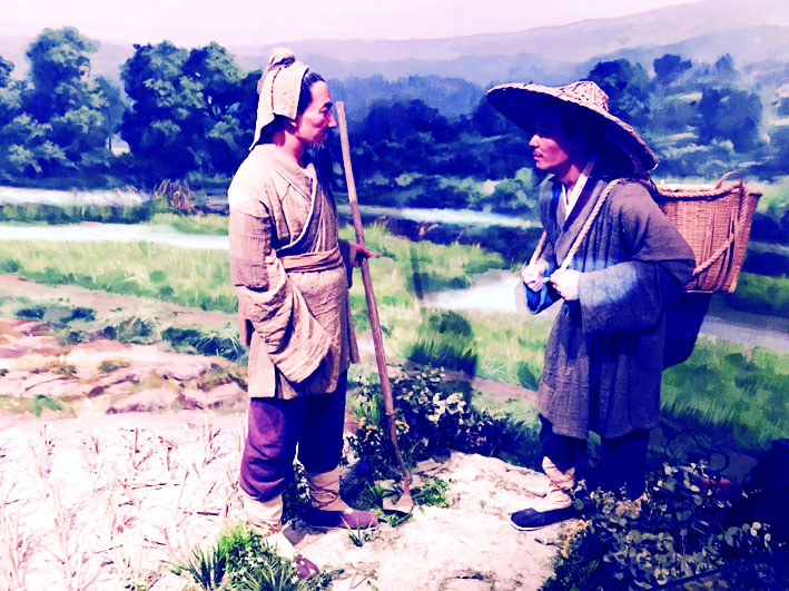蜡像里古代农夫在筛米、脱壳