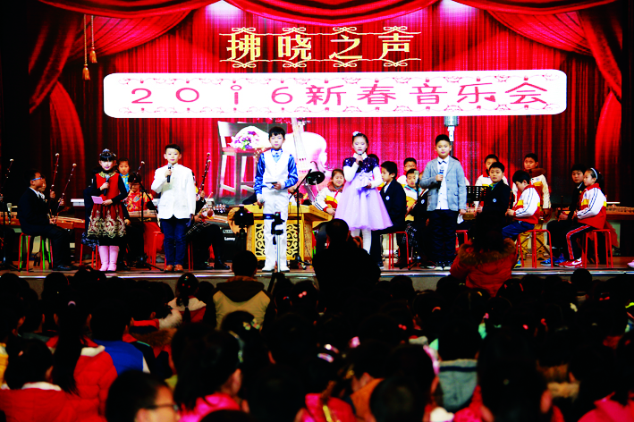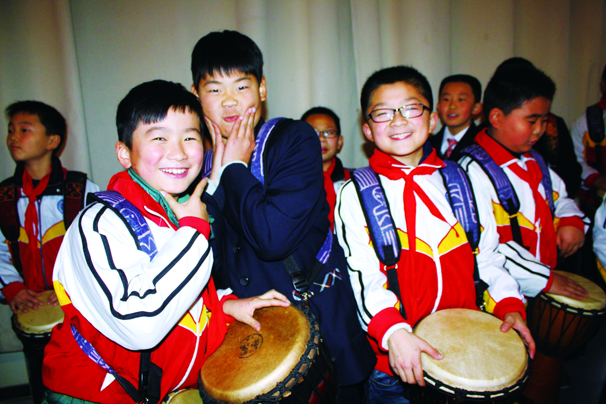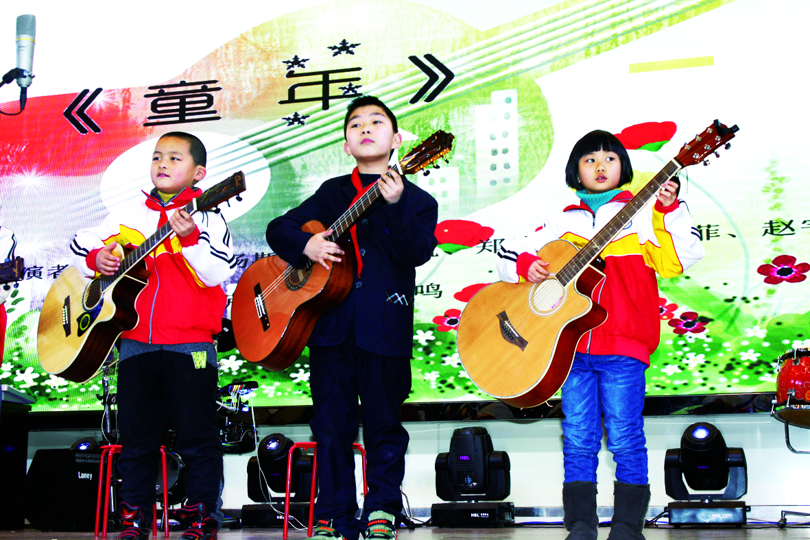 小记者采访手记 音乐会现场主持人报幕 图为吉他弹唱《童年》 后台即将上场的小鼓手们 |