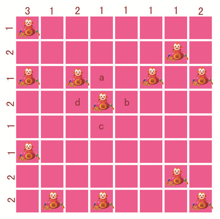 挖红包 新年咻一咻,抢红包热潮你参与了没?今天的超级大头王,考验的就是你的抢红包运气怎么样。不过,这里的红包不是用来抢的,而是要从红包田里挖出来。 小福猴们有块红包田,在田里埋下种子,新年就能长出一个大红包。右图8×8的方格,就是小福猴们的红包田,每只小猴都种出了一个大红包。这个红包在小猴四周的某个方格中,但不可能出现在对角线位置上(比如,图中第四行小猴的红包,就藏在a、b、c、d其中一个方格中)。同时,两个红包的位置不会相邻,它们是间隔地藏在表格中。每行每列的红包数都已经标示在表格边上,请仔细找一找,小猴们的红包到底在哪些地方呢?