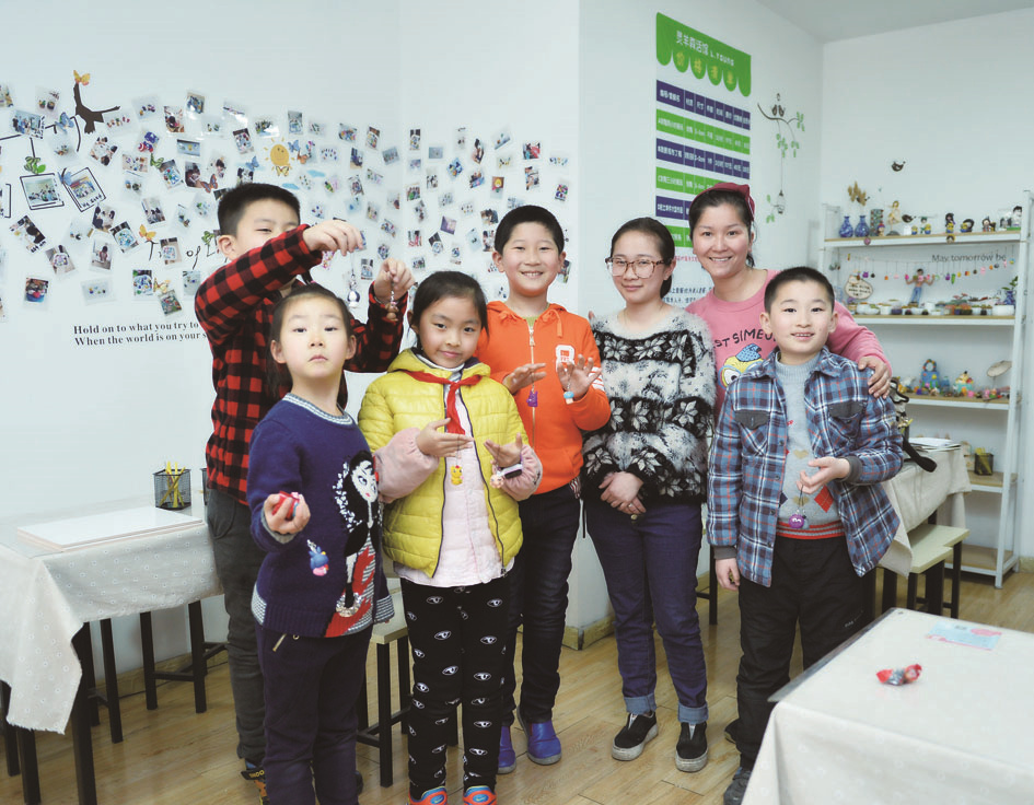 下图为:学生记者们和软陶达人婧婧姐姐(右三)合影