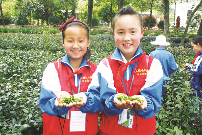 为了让小记者们体会采茶的过程,赵厂长带小记者们去茶园采茶,不过采茶叶也有标准,一般采一芽一叶和一芽两叶,小记者们也从中体会到劳动的艰辛和幸福生活的来之不易。