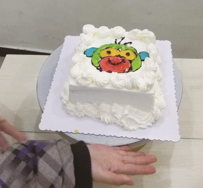 2.第一层奶油抹匀后,放入切碎的水果黄桃,再放上另一块准备好的蛋糕,加入鲜奶,用刀尖平推奶油,使整个蛋糕全被奶油包住。 3.完成后,师傅在奶油蛋糕上用尺子沿蛋糕周围画了边框,裱花不能超过边框。今年是猴年,我们用牙签在奶油蛋糕上慢慢地画了个猴脸,然后用巧克力勾边,再用自己喜欢的颜色着色。 4.着色后,师傅教我将鲜奶油装入小喷枪,挤出带波浪的奶油花边围在之前不许超过的边框上,装饰蛋糕,再在蛋糕的四周放了水果黄桃。 哈哈,我的DIY蛋糕就这样做好了,还可以吧。看似很困难,但只要细心还是可以的,亲爱的同学们,你们也赶快试试吧! |