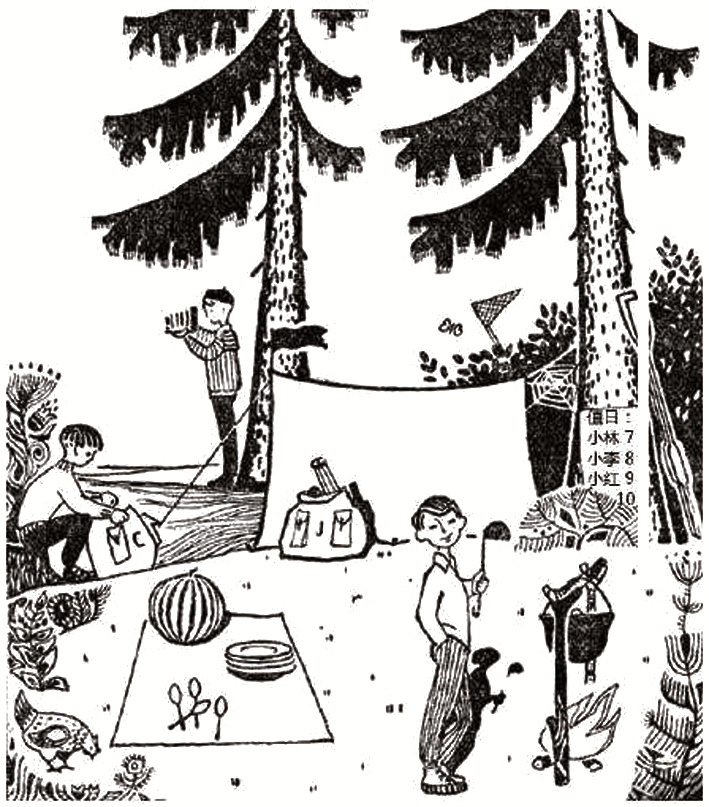 请问:1.这个营地有多少旅客? 2.他们是什么时候到的? 3.他们怎么来的? 4.离这里最近的小镇远吗? 5.风是从哪边吹来的?南边还是北边? 6.图中现在大概是几点? 7.小张去哪了? (答案下期揭晓) 上期答案:1.飞机。其他人半路跳伞下去,而小赵等到机场走楼梯才下去。2.甲。甲与丁的话互为矛盾,既然矛盾,必定一真一假。又因为题干中告诉我们四人所说的话中只有一个为假,所以乙和丙说的是真话,即“是甲干的”是正确的,所以甲说的是假话。3.超过第三名选手并没有超过第一名、第二名,所以是第三名。