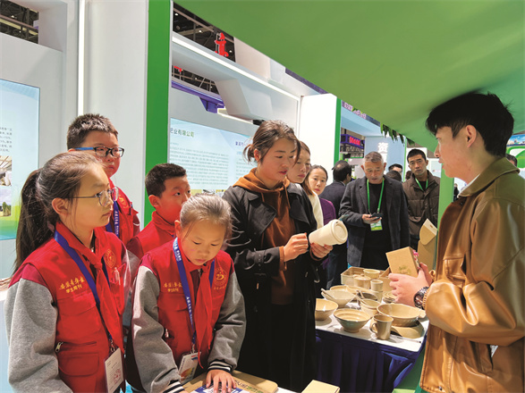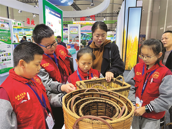肥料、菌菇、置物筐、餐盒……展馆大厅内,四处琳琅满目的秸秆制品引来学生记者们的一阵惊呼。在合肥市螺岗小学教科研副主任王志宏老师的带领下,大家来到一个摆放了精美餐具的展位。“叔叔,这些餐盘和杯子都是秸秆做成的吗?”学生记者潘昕怡十分好奇。“是的,它们的原材料都是秸秆,而且与传统的陶瓷餐具相比,秸秆制成的餐具更能抗菌防霉,还不容易碎裂。”该展位负责人甘昱程介绍道。