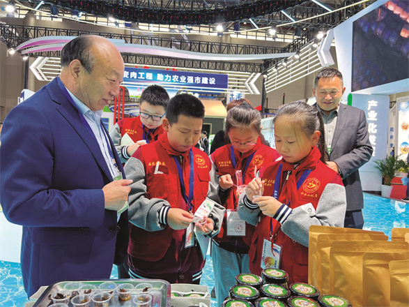“小记者们,快来尝尝我们的酱蘑菇。”号称“蘑菇大王”的丁伦保伯伯热情地邀请学生记者们品尝自家展位的酱料,“这是由五种菌菇制作而成,经科学的配制,保持了蘑菇原有味道、口感和营养成分。”丁伦保伯伯还补充道,“蘑菇的培养基可是粉碎后的秸秆哦,一斤秸秆能产一斤蘑菇,而秸秆种植蘑菇后,不仅能作为牛羊的饲料,还能作为肥料还田,得到循环利用。”听完介绍,学生记者们竖起了大拇指。