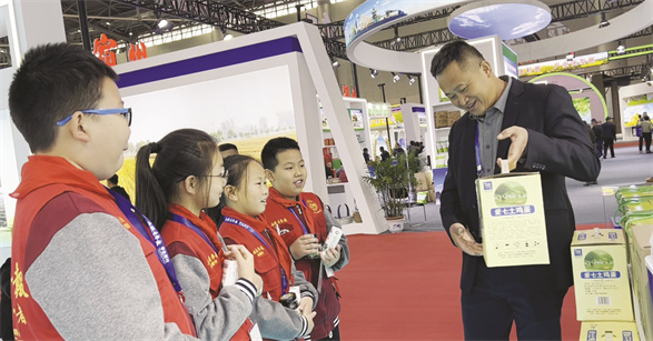 随后,学生记者们又来到农产品展示区,与其他展位不同的是,其中一个展位只有鸡蛋的展示,“咦,难道秸秆与鸡的养殖也有关系吗?”学生记者王若妍提出自己的疑问。“没错,我们的养殖场将秸秆初步粉碎后作为散放土鸡夜晚的垫料,然后定期清除垫料还田,做到真正的生态循环综合利用,既解决了农作物秸秆,又降低了养殖成本,还解决了农田的土壤改良难题,是真正意义上的生态循环综合利用。”一旁的展位负责人鲁义叔叔提起一箱鸡蛋向学生记者们介绍起来,“我们的鸡都是散养、正宗的土鸡,吃的食物也是原生态无污染的,生产的鸡蛋营养价值也很高。”