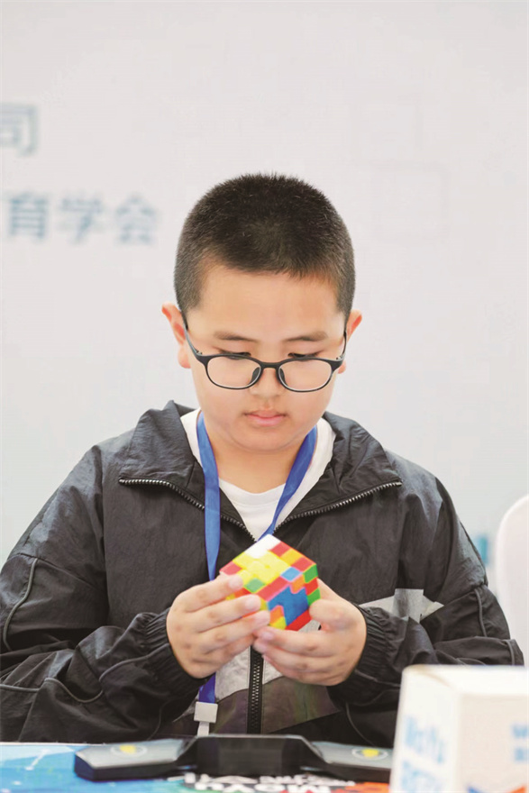 我接触魔方的时候还是一名幼儿园小班的小朋友,当时的我很好奇魔方是什么。后来爸爸妈妈给我报了魔方兴趣班,随着课程由易到难,我渐渐地有点厌烦。但看到爸爸能熟悉地还原六面时,我又燃起了好胜心,不想输给爸爸,于是我慢慢地记口诀,练速度,终于,我也能还原六面了。经过一段时间的学习后,我参加了机构的魔方公开赛,荣获“魔方小达人”称号。上小学后,我陆续参加了魔方市赛、省赛、国赛,今年还代表学校参加第五届全国智力运动会全国魔方比赛,拿了团体一等奖、个人AI智能魔方赛三等奖。