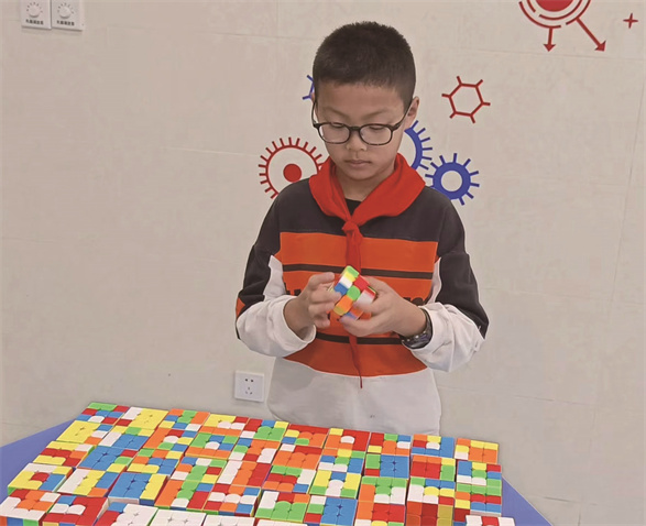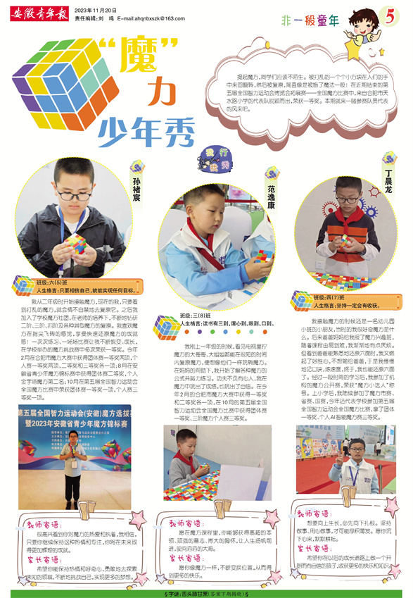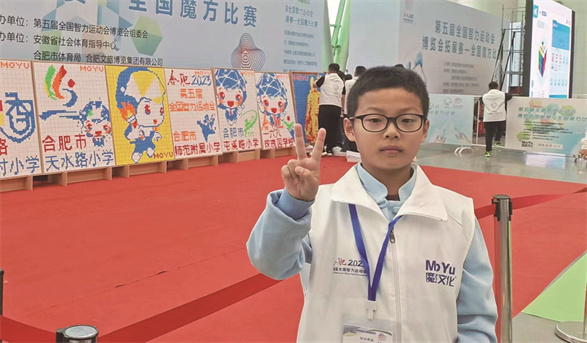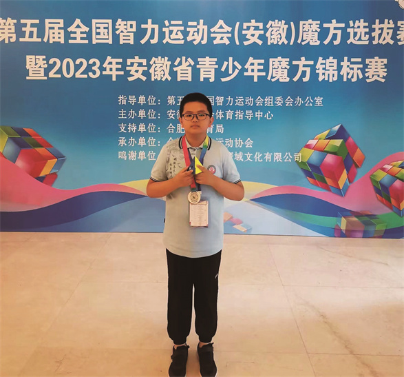 我从二年级时开始接触魔方,现在的我,只要看到打乱的魔方,就会情不自禁地去复原它。之后我加入了学校魔方社团,在老师的培养下,不断地钻研二阶、三阶、四阶及各种异型魔方的复原。我喜欢魔方在指尖飞转的感觉,享受快速还原魔方的成就感!一次次练习、一场场比赛让我不断蜕变、成长,在学校举办的魔方挑战赛中多次荣获一等奖。今年2月在合肥市魔方大赛中获得团体赛一等奖两项,个人赛一等奖两项,二等奖和三等奖各一项;8月在安徽省青少年魔方锦标赛中获得团体赛二等奖,个人金字塔魔方第二名;10月在第五届全国智力运动会全国魔方比赛中荣获团体赛一等奖一项,个人赛三等奖一项。