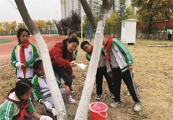 近日,安徽师范大学附属肥东实验学校组织少先队员代表开展护树活动——“给小树穿冬衣”。活动过程中,队员们分工明确,配合默契,忙中有序,细致耐心地为大树“穿冬衣”。在大家的努力下,一排排树木纷纷穿上了御寒的“白大衣”,整齐美观,色彩明亮。