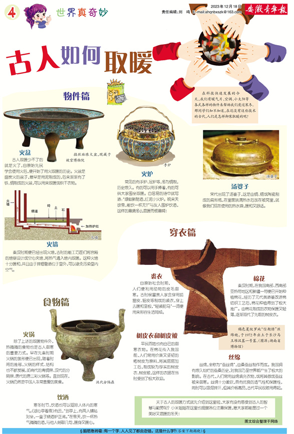 在科技快速发展的今天,我们有暖气片、空调、小太阳等各式各样的物件来帮助我们度过寒冬。那同学们知不知道,在还没有这些技术的古代,人们是怎样御寒取暖的呢?