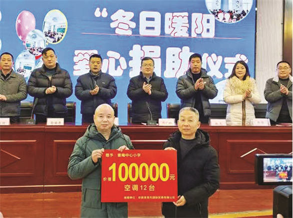 近日,淮南市田家庵区曹庵中心小学举行“冬日暖阳”爱心捐助仪式,该校校友、安徽圣宝元国际贸易有限公司董事长邵志强为学校12个教学班购置并安装了12台“爱心”空调,让学生们在四季如春的教室享受优质的教育服务资源。